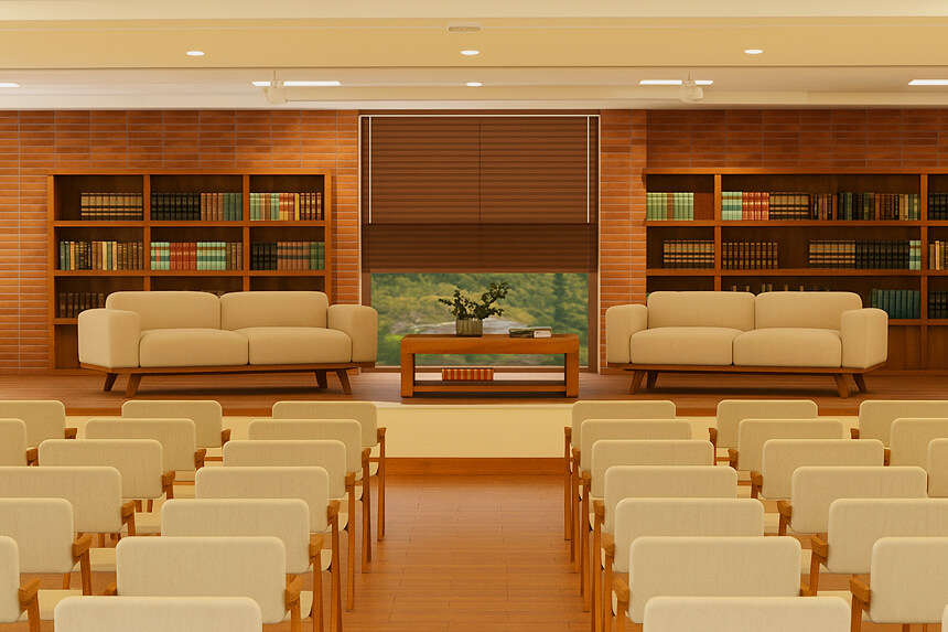 Stage/lectern, projector or large display, microphones, basic lighting, Wi‑Fi, chairs/tables per layout, and on‑site coordination. Add‑ons: podcast/recording room, extra AV, branding surfaces, and streaming support.